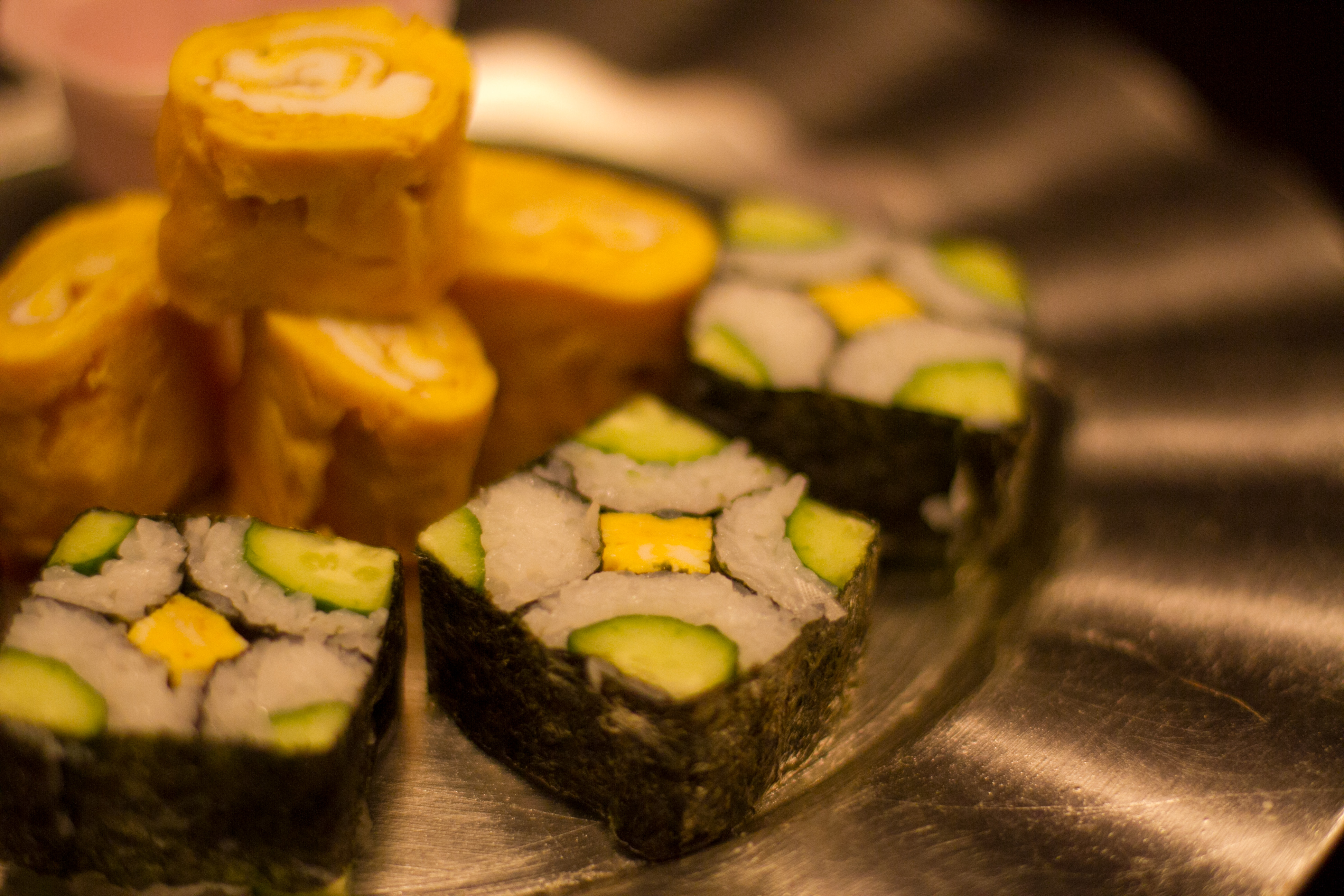 With the sukiyaki platter ready to go, we moved onto our appetizer platter. We made a dish called namasu which is pickled cucumber and wakame seaweed, Japanese egg omelet, and a decorative sushi roll.