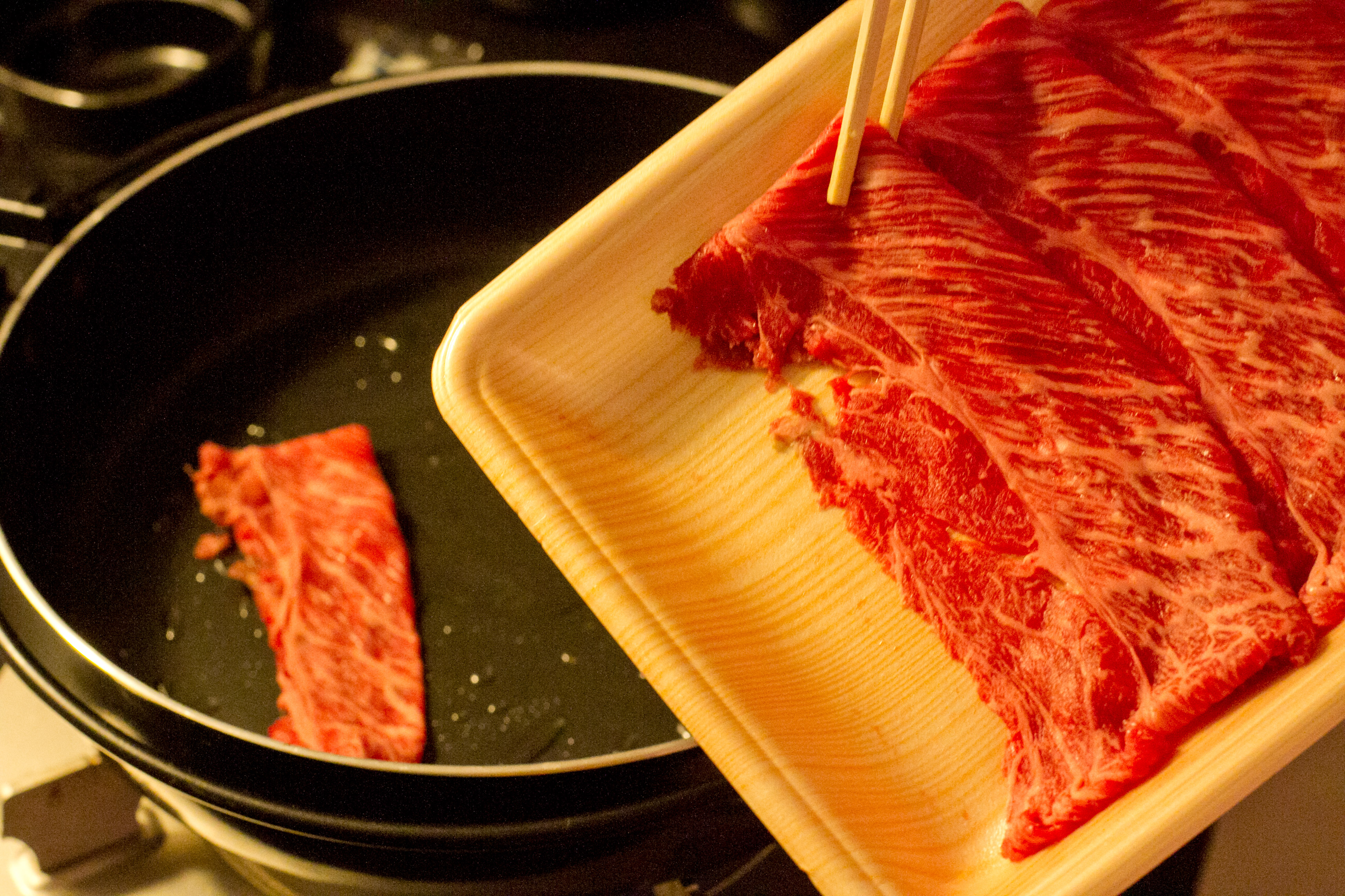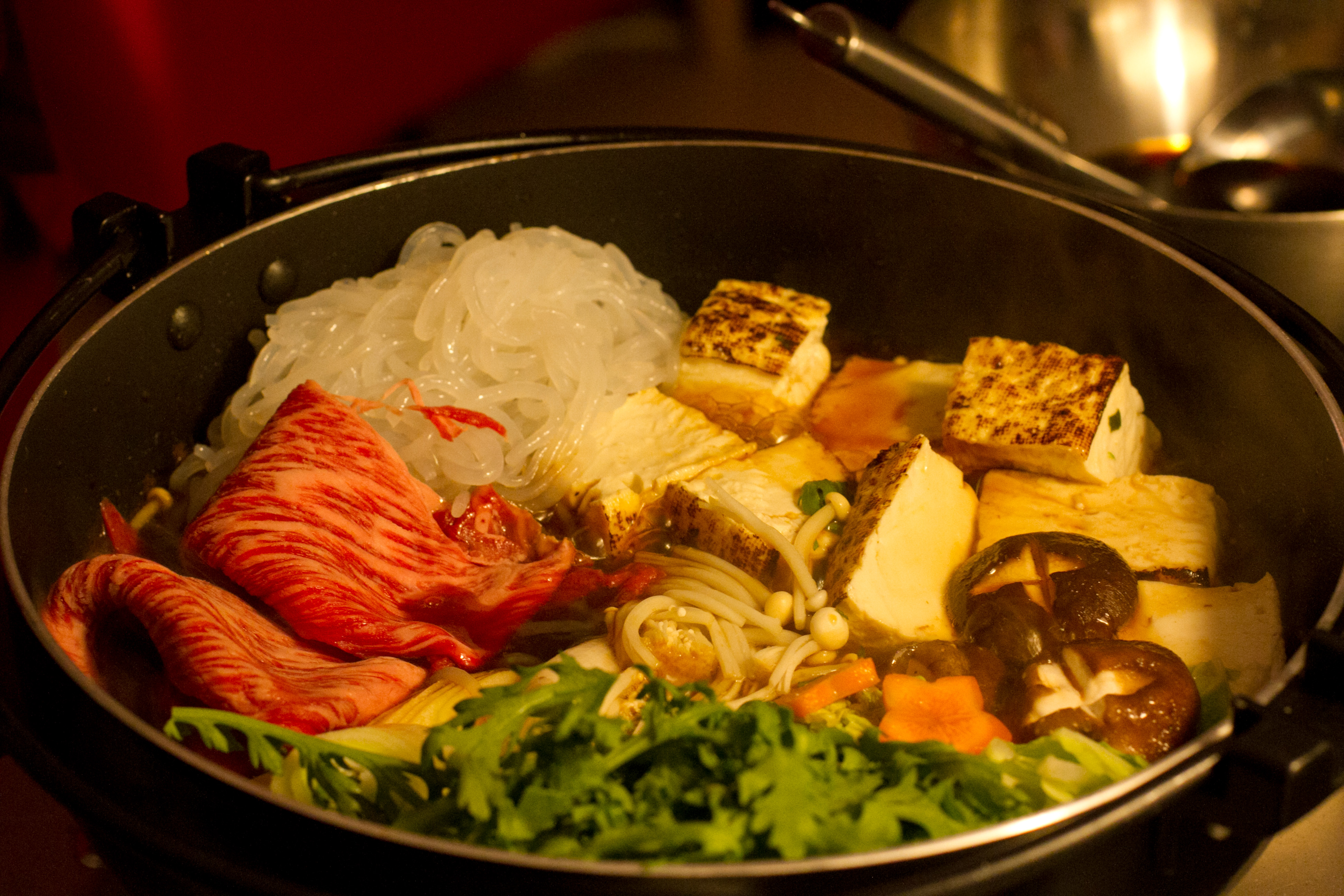 The other cultural tidbit that we learned was that there are two types of sukiyaki, Kanto- and Kansai-style. The first major difference is the sauce. The Kanto-version requires warishita sauce to be prepared ahead of time. For the Kansai-version, it is added after the beef has begun cooking. There is also a variance in sauce flavor. People in the Kanto prefer a saltier version while the Kansai area prefers a sweeter version.